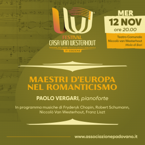 Festival Casa Van Westerhout Mercoledì 12 novembre 2025, ore 20.00Teatro Comunale Niccolò van Westerhout, Mola di Bari MAESTRI D'EUROPA NEL ROMANTICISMO PAOLO VERGARI pianoforte…