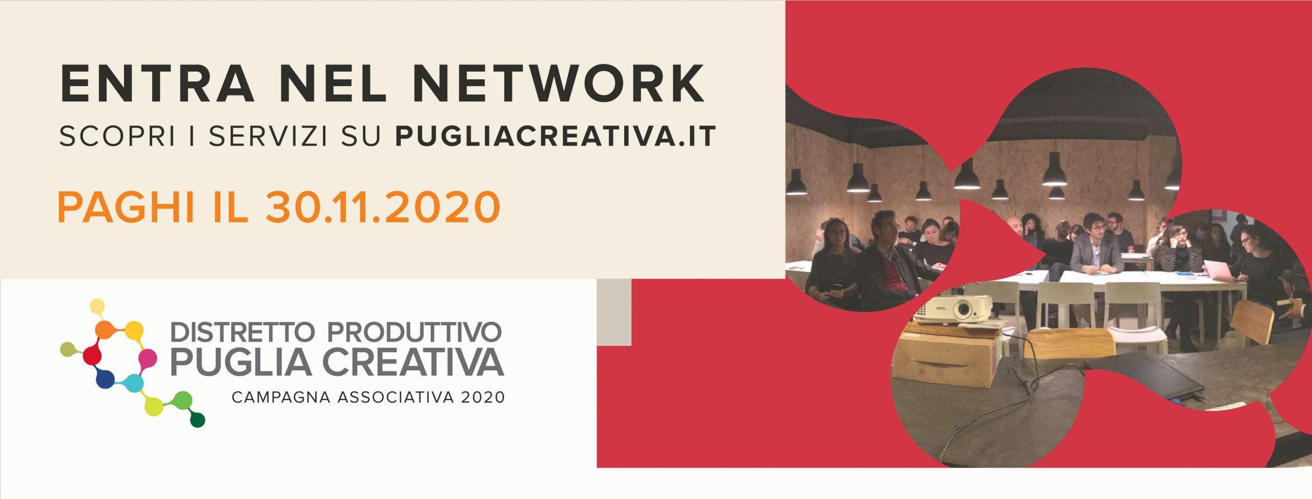 Con la campagna Insieme siamo più forti: Associati ora – paghi il 30.11.2020 Puglia Creativa garantisce a tutti coloro che ne abbiano i requisiti la possibilità di associarsi senza dover contestualmente versare la quota associativa che viene rinviata al 30 novembre.